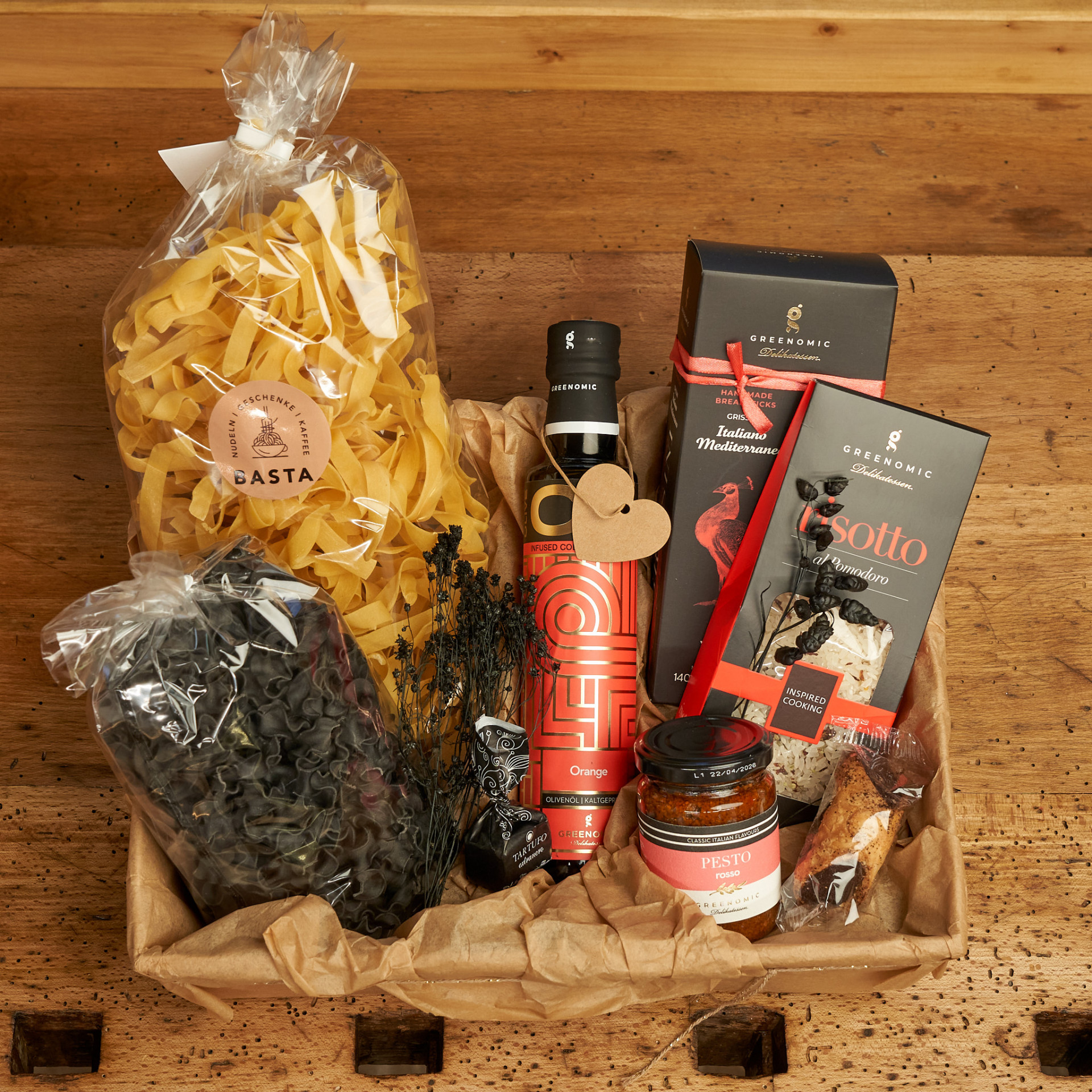 Der „Nero“ zelebriert die raffinierte Eleganz der Farbe Schwarz mit einer sorgfältig ausgewählten Kollektion von Delikatessen aus der mediterranen Region. Dieser Korb ist ideal für alle, die das Außergewöhnliche schätzen und sich von feinen, vielfältigen Geschmäckern verwöhnen lassen möchten.