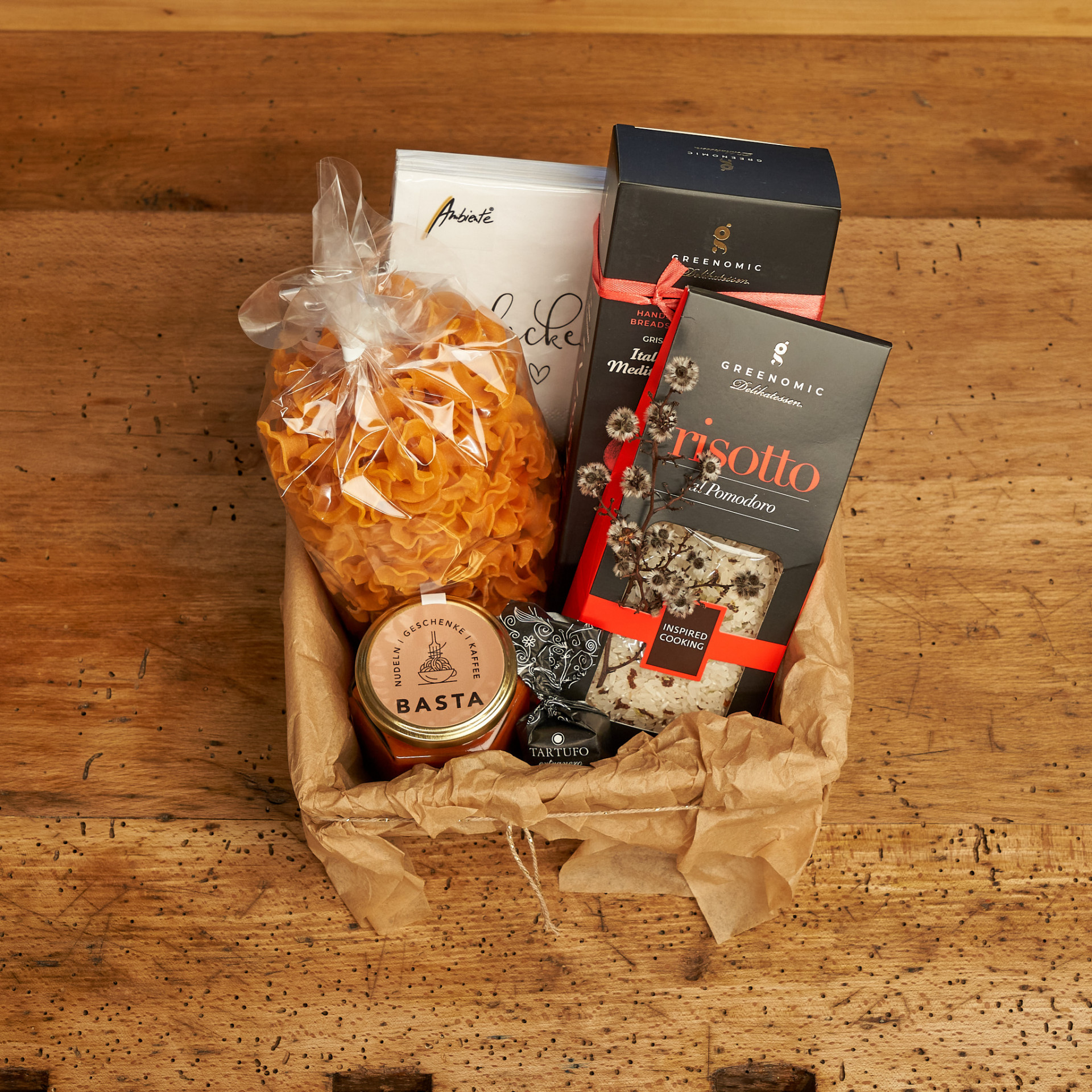 Der „Little Italy“ bringt die Wärme und den Geschmack des Mittelmeerraums direkt zu dir. Jedes Element dieses Korbs feiert die Essenz sonnengereifter Tomaten und anderer mediterraner Spezialitäten. Ideal für Genießer warmer Aromen.