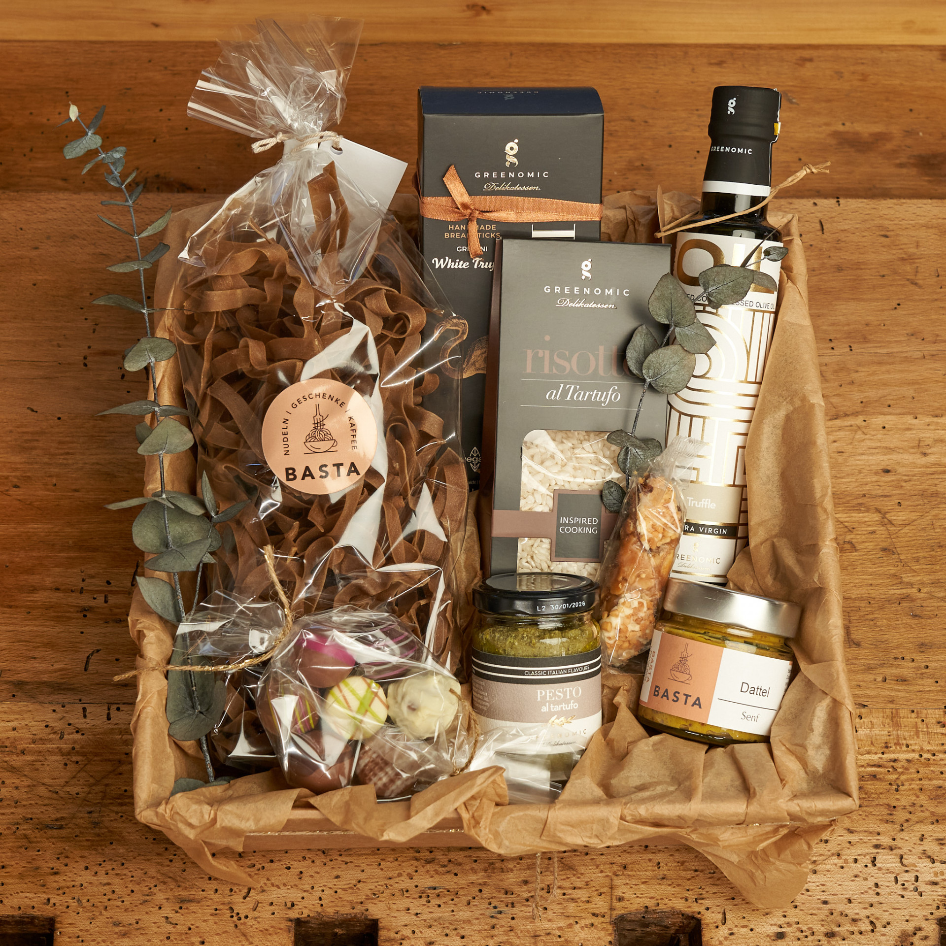 Der „Trüffel“ ist eine exquisite Zusammenstellung für alle Liebhaber des edlen Trüffels. Mit einer Auswahl an Trüffelspezialitäten und fein abgestimmten Produkten ist dieser Korb das ideale Geschenk für Gourmets.